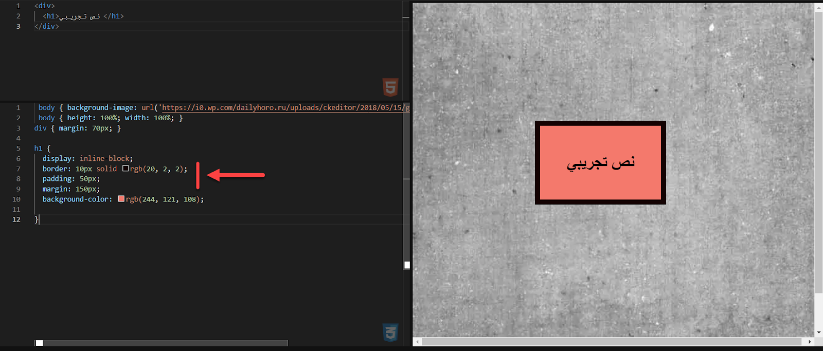 - Border: يحدد الإطار الخارجي للعنصر، وذلك بوحدة البكسل، مع إمكانية إضافة لون الإطار بالتتابع مع خصائص Color.