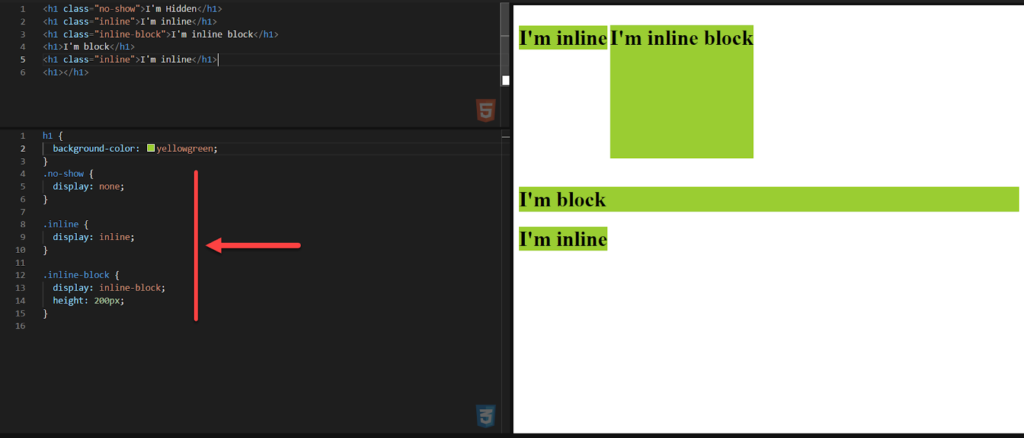 - Inline: تقوم بحذف كافة الفواصل في بداية ونهاية العنصر، وبالتالي لا يتأثر العرض بخصائص العرض والارتفاع.