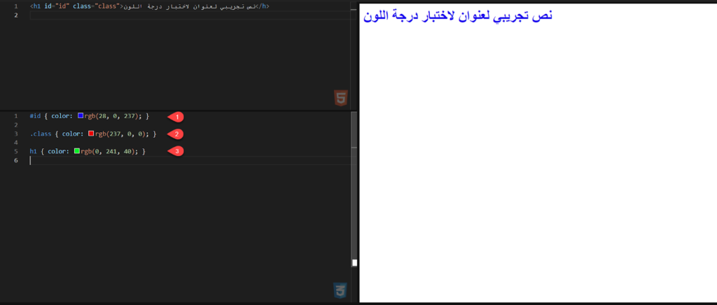 على سبيل المثال عند تعريف عنوان محدد بدرجة اللون الأخضر بالاعتماد على عنصر العنوان، وبعد ذلك تعريف لون أحمر للعنوان بالاعتماد على فئة العنوان، ثم تعريف لون أزرق للعنوان بالاعتماد على معرف العنوان، ستلاحظ أن النتيجة النهائية في المتصفح هي اللون الأزرق طبقًا لنظام التخصص، وذلك كما موضح في الصورة التالية: