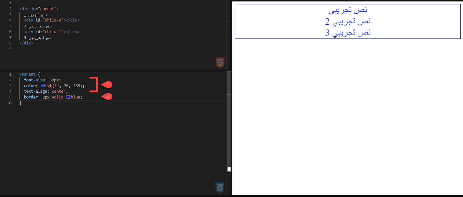 على سبيل المثال عند كتابة كود CSS لقسم رئيسي يحدد حجم الخط ولون الخط واتجاه المحاذاة والحدود الخارجية، ستلاحظ تطبيق خصائص الخط من الحجم واللون والمحاذاة على كافة الأقسام الفرعية داخل القسم الرئيسي، ولكن سيتم تطبيق الحدود الخارجية على القسم الرئيسي فقط، وذلك كما موضح في الصورة التالية: