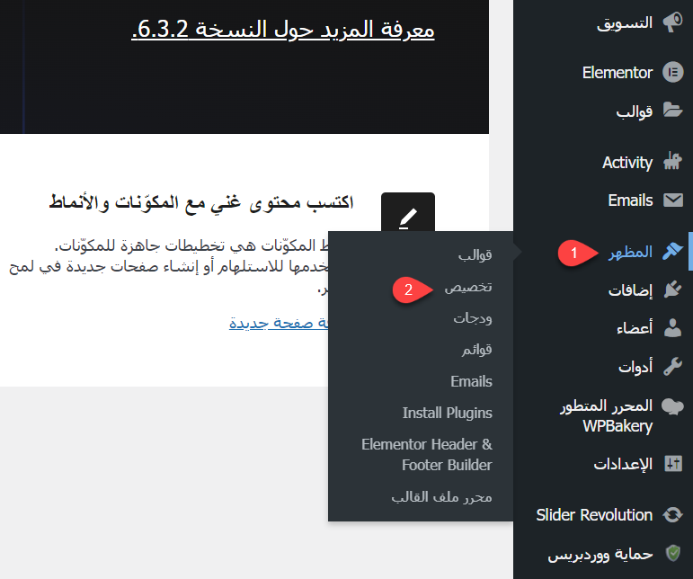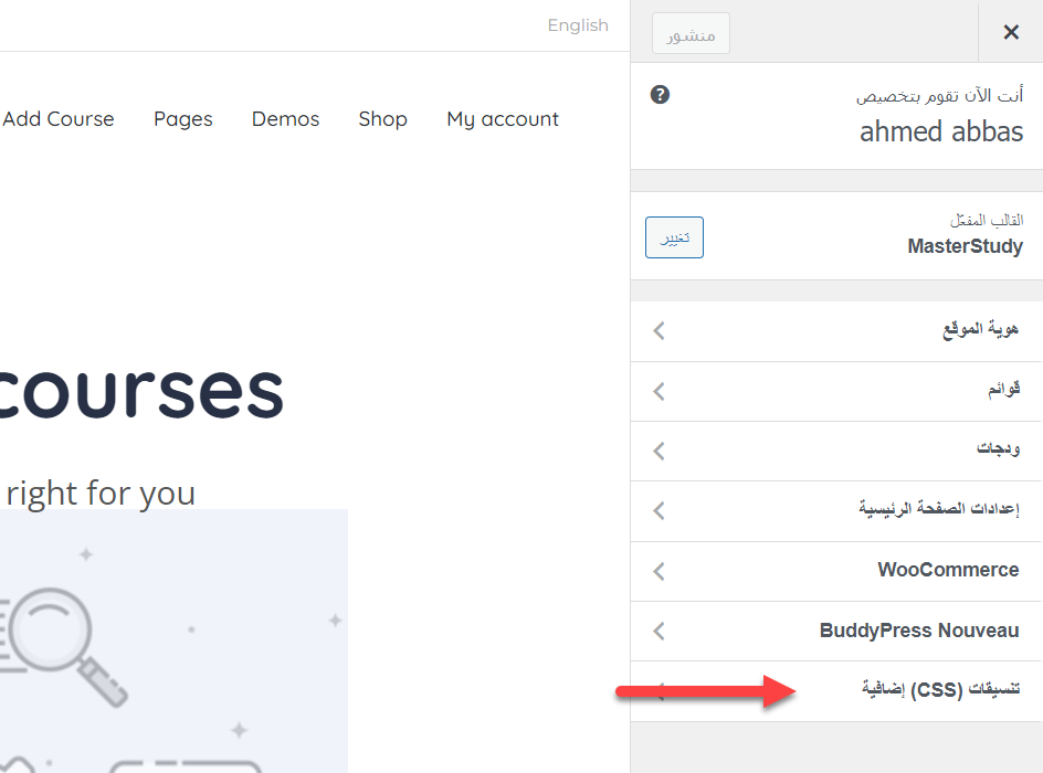 ستظهر لك قائمة تخصيص القالب، وستجد أغلب عناصر تلك القائمة مشتركة بين كافة قوالب ووردبريس، فتقوم بالضغط على تنسيقات CSS إضافية، كما موضح في الصورة التالية:
