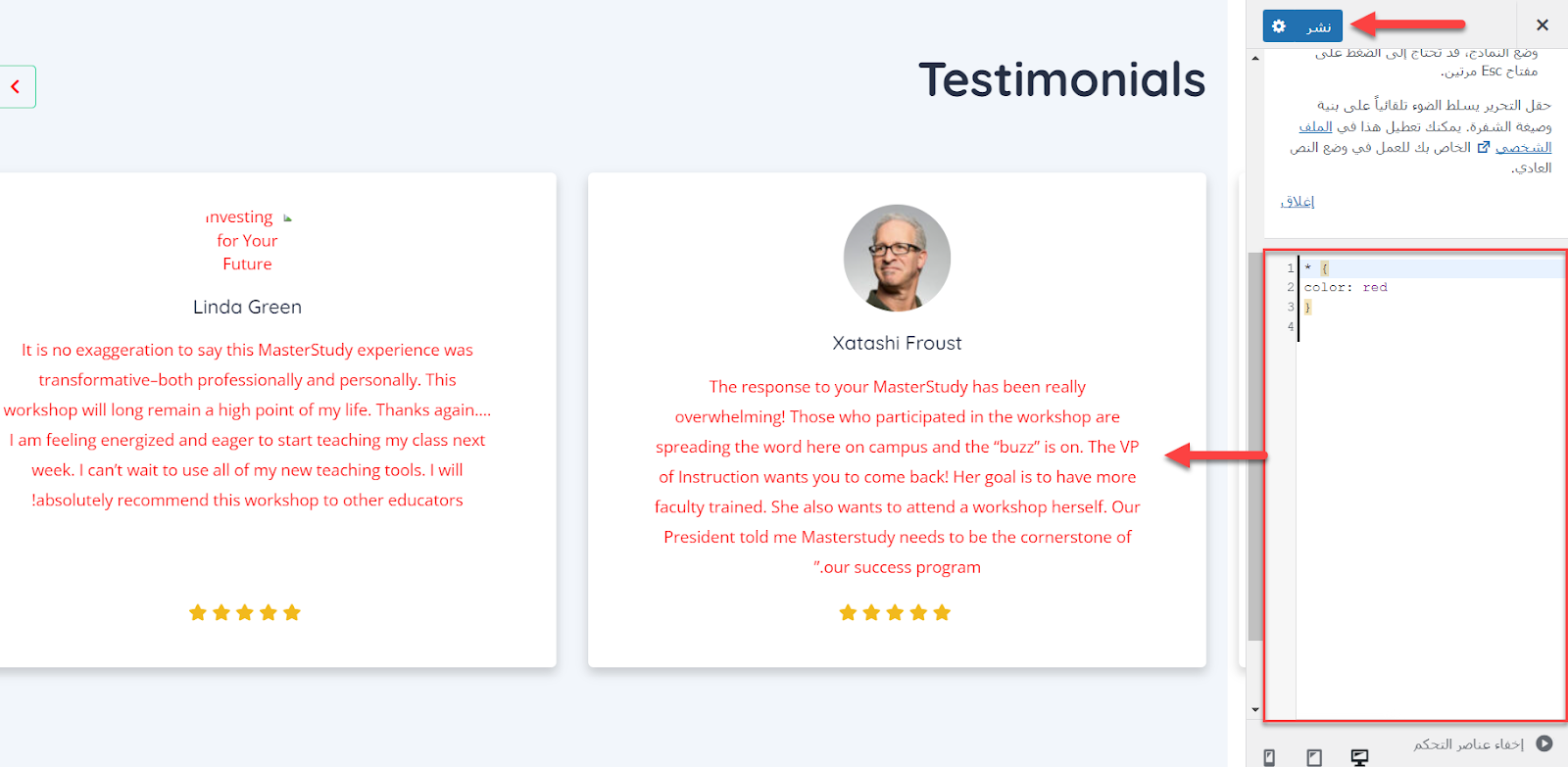 بعد ذلك تقوم بكتابة كود CSS المطلوب، وستجد نتيجة الكود يتم تطبيقها مباشرًا على صفحة الويب أو العنصر المستهدف، وبعد الإنتهاء من التعديلات تقوم بالضغط على نشر، وذلك كما موضح في الصورة التالية: