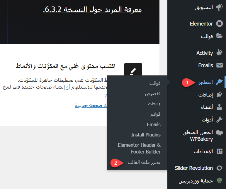 يمكنك أيضًا إضافة أكواد CSS على ملفات القالب مباشرًا، ومعاينة كافة أكواد CSS المطبقة على القالب والتعديل عليها، وذلك عن طريق الرجوع إلى لوحة ووردبريس الرئيسية، ثم اختيار المظهر >> محرر ملف القالب، كما موضح في الصورة التالية: