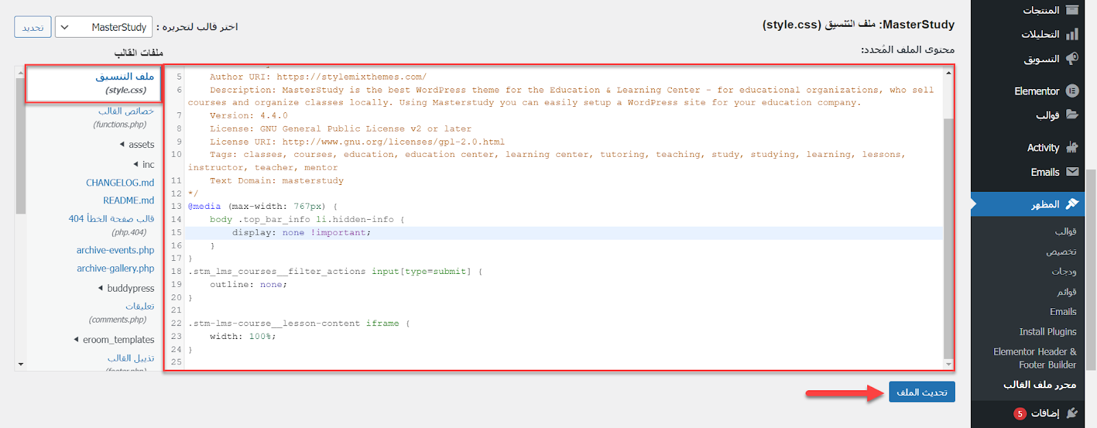 تقوم بالبحث عن ملف التنسيقات Style.css ضمن ملفات القالب، وستظهر لك كافة أكواد CSS المطبقة على القالب، يمكنك التعديل على تلك الأكواد مباشرًا أو إضافة أكواد جديدة، وبعد الإنتهاء من التحديثات تقوم بالضغط على تحديث القالب، كما موضح في الصورة التالية: