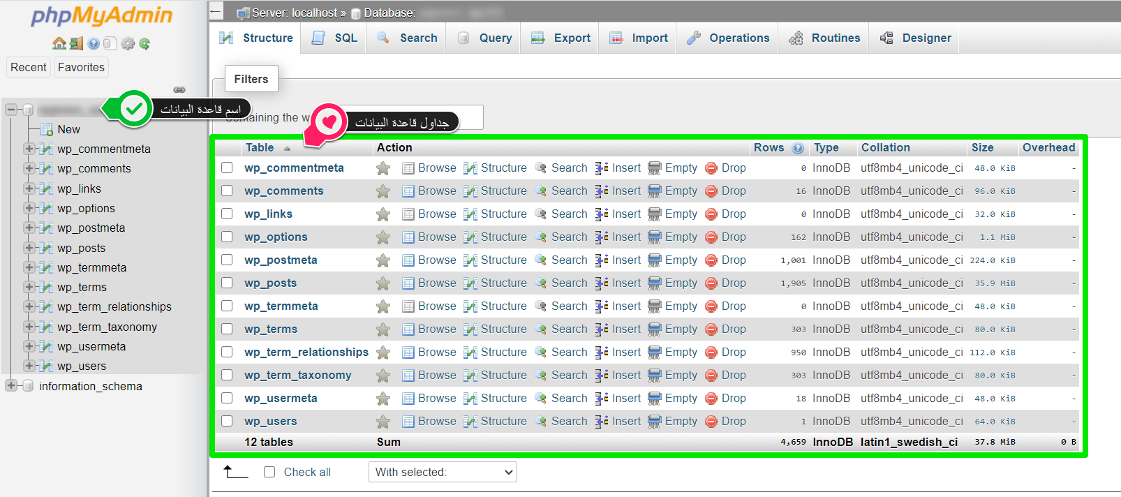 تحتوى كل قاعدة بيانات على 12 جدول افتراضي، وكل جدول يحتوي على بيانات الأقسام والمستخدمين وغيرها من الوظائف المختلفة للوردبريس وبالنظر إلى الصورة التالية يمكنك بسهولة معرفة أماكن التخزين من موقع الويب الخاص بك.