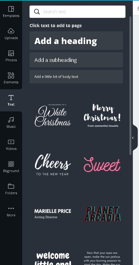 اختر خيار إضافة النص وسيظهر لك مجموعة قوالب نصية جاهزة ولكنها جميعها باللغة الإنجليزية. لكن لا تقلق فالتطبيق يحوي آلافًا من الخطوط ومن بينها العربية. لسهولة البحث اكتب في خانة البحث Arabic وستظهر لك الخطوط العربية منها المجاني ومنها المدفوع.