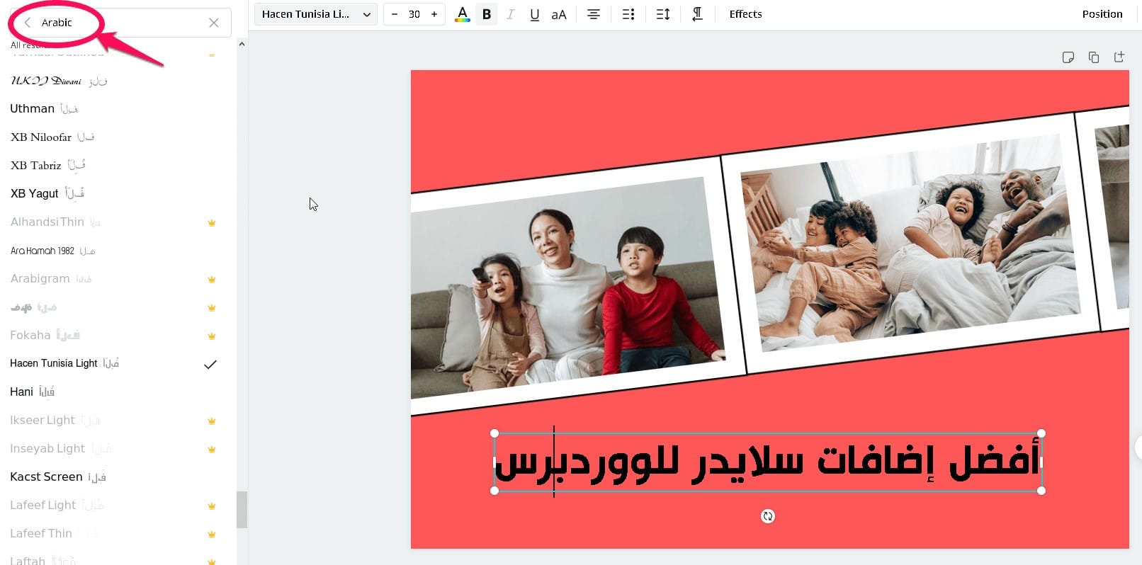 اختر الخط المناسب واكتب العنوان ثم بدّل حجمه وموقعه وخصائصه التي ستجدها في القائمة العلوية.