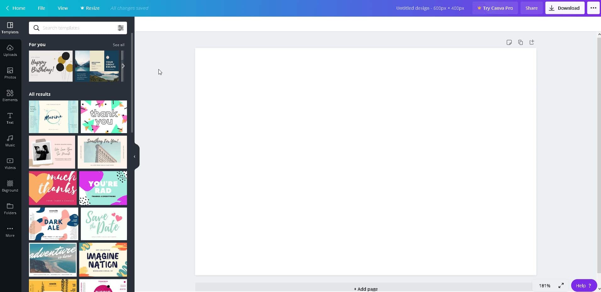 ستشاهد من خلال هذه الصفحة تنوع القوالب الجاهزة التي يمكنك استخدامها لبناء تصميمك بدلًا من البدء من الصفر ولكننا سنبدأ من الصفر فعليًا لتعلّم أكبر قدر من مزايا التطبيق.