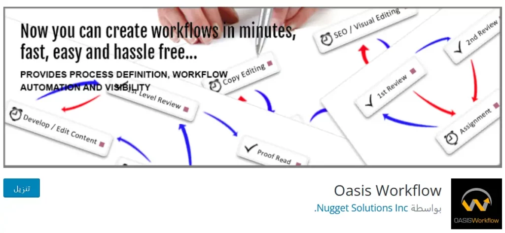 قد يحتاج صاحب الموقع إلى توظيف محررين ومدققين؛ ليفحصوا المحتوى الموجود، ثم يحررونه ويعدلون الأخطاء الموجودة بداخله. لذلك، تساعد إضافة Oasis Workflow على تنظيم تلك العملية ومتابعة سير العمل، حتى يتم على أكمل وجه.