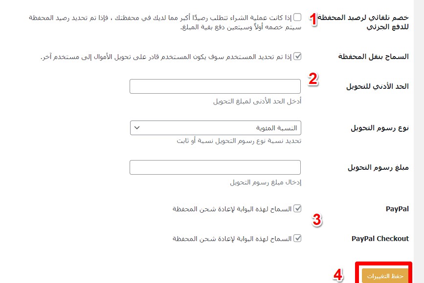 - السماح بنقل الرصيد بين المستخدمين: يمكنك أن تسمح للمستخدمين بتحويل أرصدة فيما بينهم، ويمكنك أن تضع الحد الأدنى والأقصى لذلك. كما تستطيع أن تفرض نسبة من التحويل كعمولة للمتجر (رسوم تحويل)