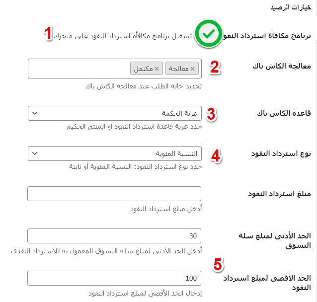 - معالجة الكاش بك: هل تريد تفعيل البرنامج على المبيعات المكتملة، في الانتظار، في انتظار مدفوعات، أو التي في المعالجة من المتجر؟ (الأفضل أن تحدد المكتملة والمعالجة فقط)