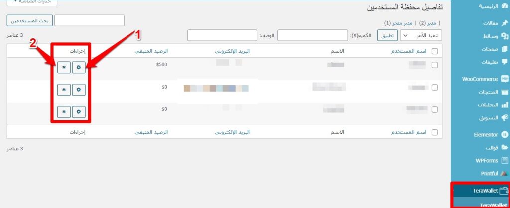 بعد تفعيل الإضافة، ستجد أن قسم جديد تم إضافته إلى الشريط الجانبي باسم Tera Wallet، عند النقر عليها ستظهر لك تفاصيل محافظ المستخدمين المسجلين في متجرك (سواء كانوا من فريق العمل، أو من العملاء) الاسم، والبريد الإلكتروني والإجراءات...