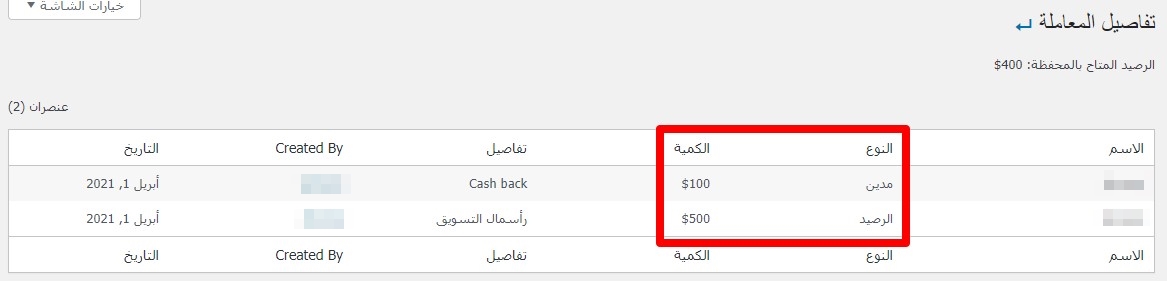 - مشاهدة تفاصيل الرصيد من دفع وسحب (بالنقر على العين)