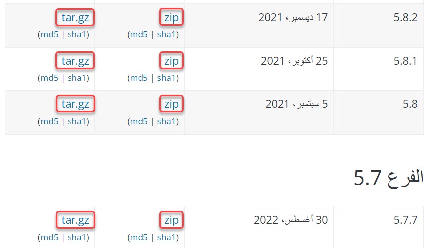 ملحوظة: يمكن تحميل آخر نسخة من الـ WordPress بتنسيق tar.gz عبر النقر على عبارة (تنزيل بصيغة .tar.gz) الموجودة أسفل زر تنزيل الووردبريس في الصورة قبل السابقة.