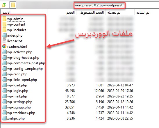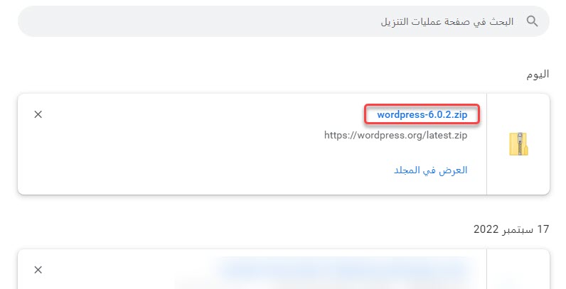 بعد انتهاء عملية التحميل، ستجد ملفًا مضغوطًا بتنسيق zip باسم شبيه بـ (wordpress-6.0.2) في مجلد التنزيلات في متصفح الإنترنت لديك أو برنامج إدارة التحميلات الذي تستخدمه، حيث تمثل الأرقام 6.0.2 رقم إصدار نسخة الووردبريس التي تم تحميلها.