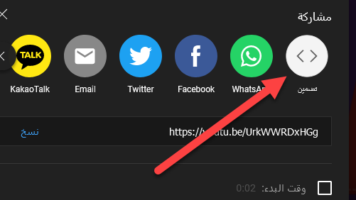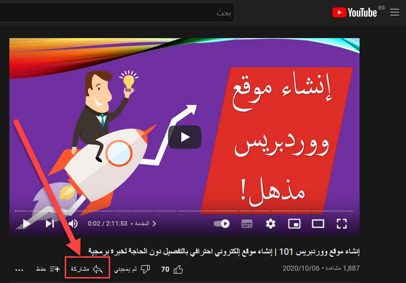 يمكنك الحصول على كود Iframe الخاص بأحد الفيديوهات على منصة يوتيوب من خلال الدخول إلى صفحة الفيديو ثم النقر على زر المشاركة: