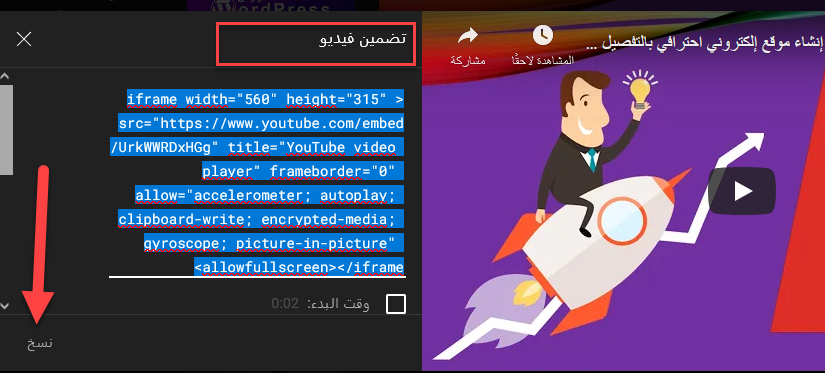 بعد ذلك سيظهر لك كود Iframe الخاص بإدراج الفيديو داخل صفحات الويب، ومن هذه الواجهة قم بالنقر على زر النسخ لكي تقوم بنسخ الكود من أجل لصقه في الخطوة التالية داخل الووردبريس: