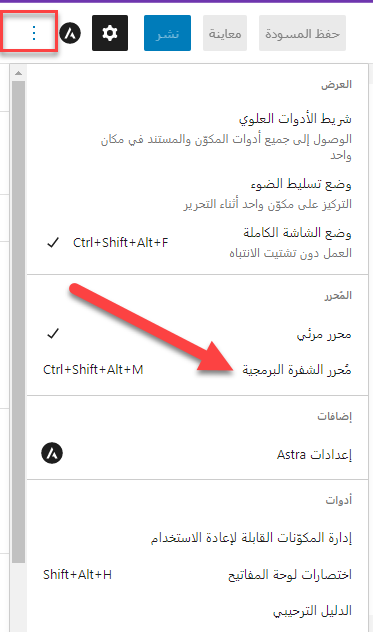الآن توجه إلى لوحة تحكم الووردبريس وقم بالدخول إلى المقالة أو الصفحة التي ترغب في إدراج Iframe الخاص بالفيديو المختار، وفي لوحة تحرير الصفحة أو المقالة قم بالدخول إلى واجهة محرر الشفرات البرمجية: