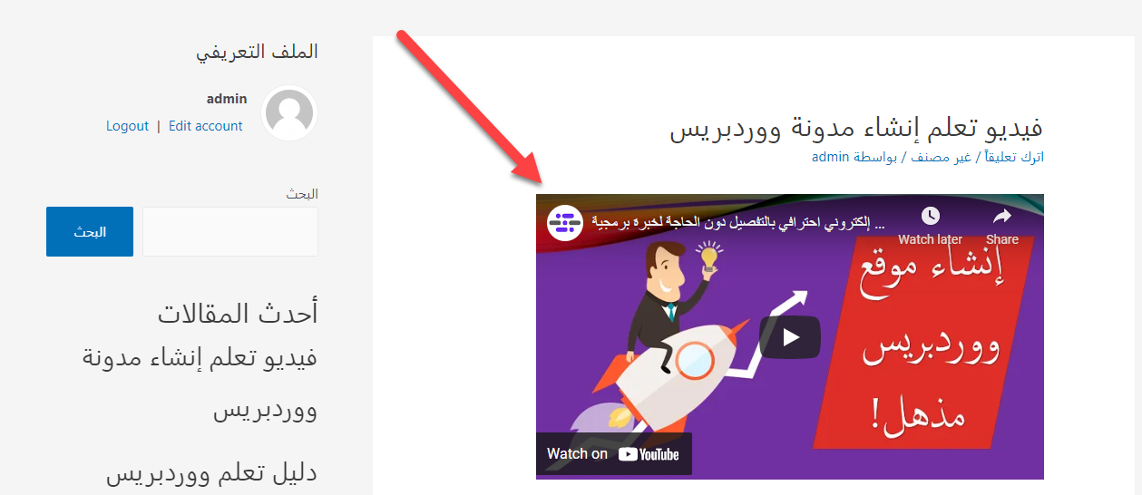 قم بحفظ الصفحة أو المقالة وتوجه إلى زيارتها وسوف تلاحظ ظهور الفيديو في المكان الذي قمت بلصق الكود داخله: