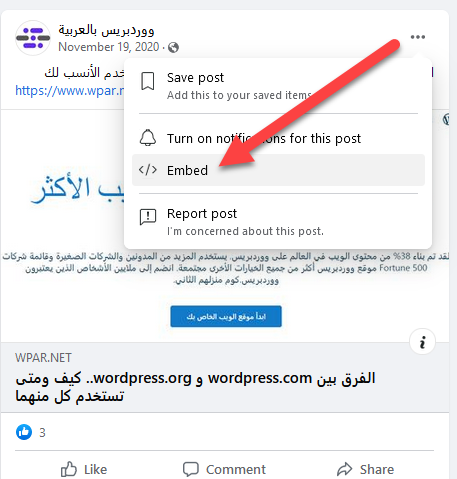 نفس الطريقة يمكنك استخدامها للحصول على كود Iframe الخاص بمنشورات موقع فيسبوك على سبيل المثال، حيث يمكنك التوجه إلى المنشور المراد إدراجه داخل الموقع ثم النقر على تبويب الخيارات الخاص بالمنشور والنقر على زر التضمين Embed: