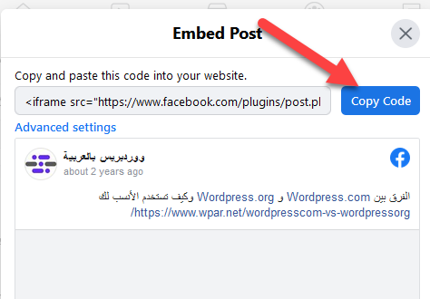 سيظهر لك مباشرة كود Iframe الخاص بالمنشور والذي يمكنك نسخه مباشرة أو النقر على زر النسخ Copy Code:
