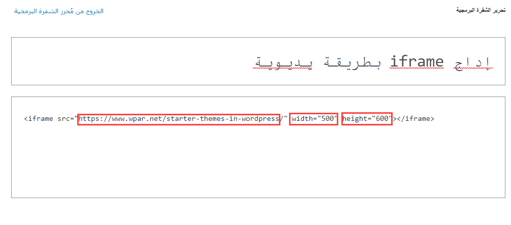 الكود المسؤول عن إدراج المحتوى من أي مصدر داخل صفحات الووردبريس هو Iframe وهو كود تابع إلى لغة  HTML ونقوم بكتابة بالشكل التالي: