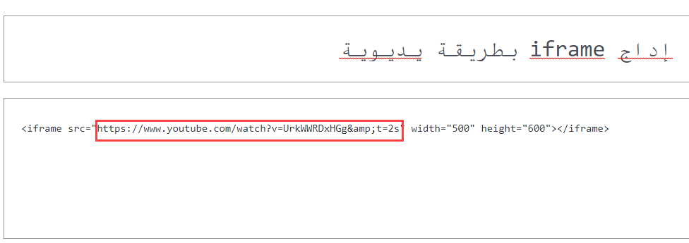 سنقوم في هذه الطريقة بكتابة كود Iframe من الصفر وذلك يساعدنا على إدراج أي نوع من أنواع المحتوى المنشور على شبكة الإنترنت بشرط أن يكون المصدر المراد الحصول على المحتوى منه يوفر إمكانية تضمين المحتوى الخاص به في جهات خارجية.