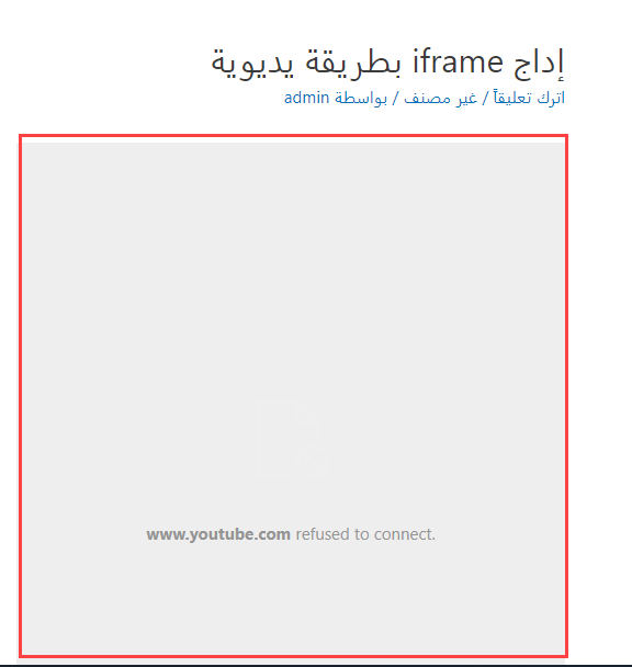 الأن عند حفظ الصفحة وزيارتها سوف نجد أن مكان Iframe موجود بالفعل لكن الفيديو لا يظهر داخله، وذلك لأن المصدر لا يسمح بإدراج المحتوى الخاص به داخل كود Iframe:
