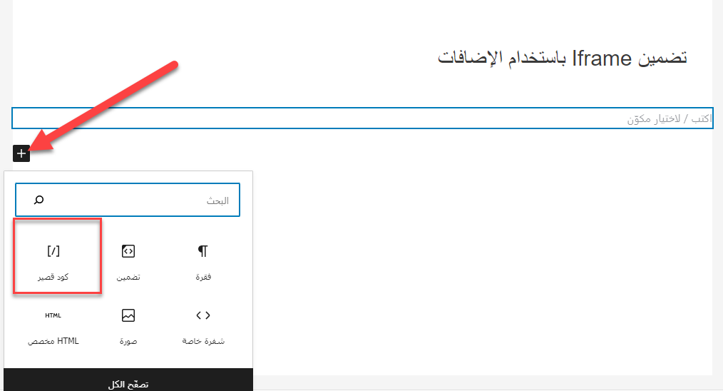 يمكنك إضافة Iframe باستخدام الكود المختصر الخاص بالإضافة بسهولة، وذلك من خلال الدخول إلى واجهة تحرير الصفحة أو المقالة داخل موقعك، ثم اختيار المكون (الكود القصير):