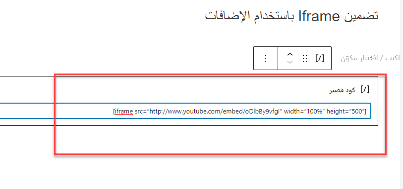 إذا كنت تستخدم محرر المكونات المتطور من ووردبريس، يمكنك الإستفادة من مكونات التضمين الإفتراضية التي يدعمها ووردبريس بدون الحاجة إلى إضافة Iframe داخل المحتوى.