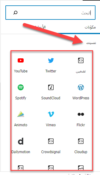يمكنك الوصول إلى مكونات الضمين الإفتراضية داخل محرر الووردبريس المتطور  بسهولة من شريط المكونات، والتي تجد بداخلها عدد كبير من المواقع والمدونات المشهورة التي بإمكانك تضمين المحتوى منها بسهولة داخل موقعك وبدون الحاجة إلى كتابة كود Iframe: