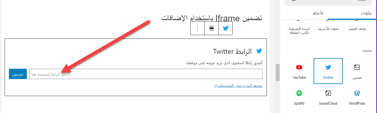 قم بإختيار المنصة التي تريد تضمين المحتوى منها إلى داخل موقعك، ثم الصق رابط المنشور أو المحتوى الذي ترغب في تضمينه، وسيظهر المحتوى داخل موقعك مباشرة دون الحاجة إلى كتابة كود Iframe. لكن بالتأكيد هذه الطريقة تصلح فقط للمواقع التي تدعمها ووردبريس لتضمين المحتوى منها بصورة مباشرة: