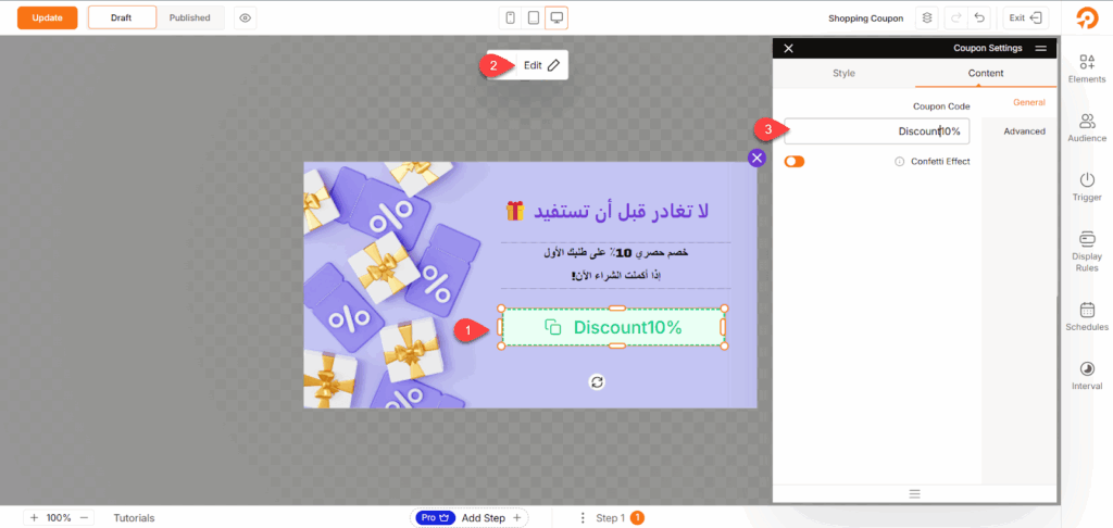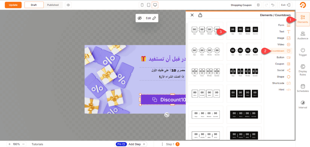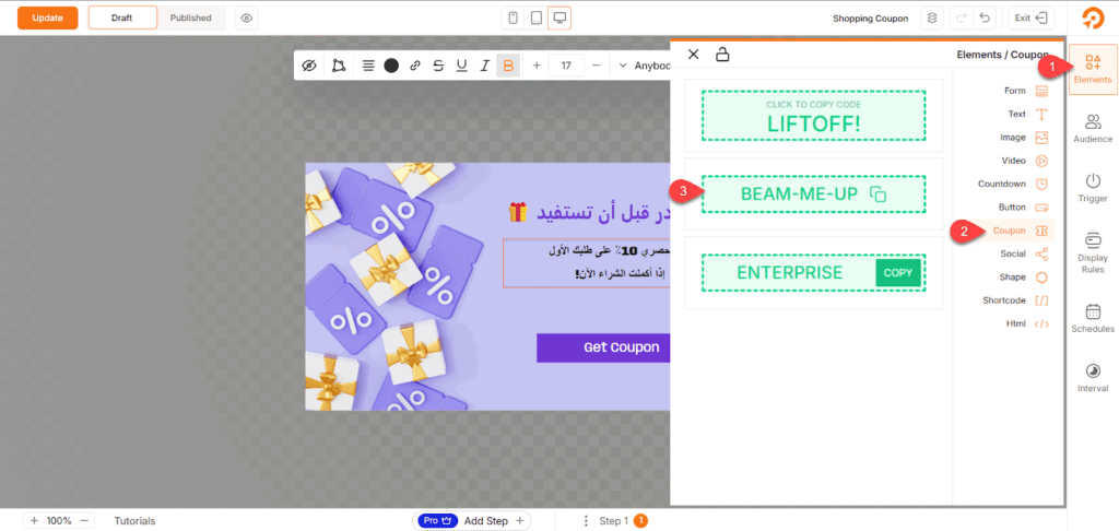 على سبيل المثال، أضفت كوبون خصم مخصص من خلال الضغط على أيقونة Elements في القائمة الجانبية، ثم اختيار Coupon وتحديد طريقة العرض المناسبة للكوبون.