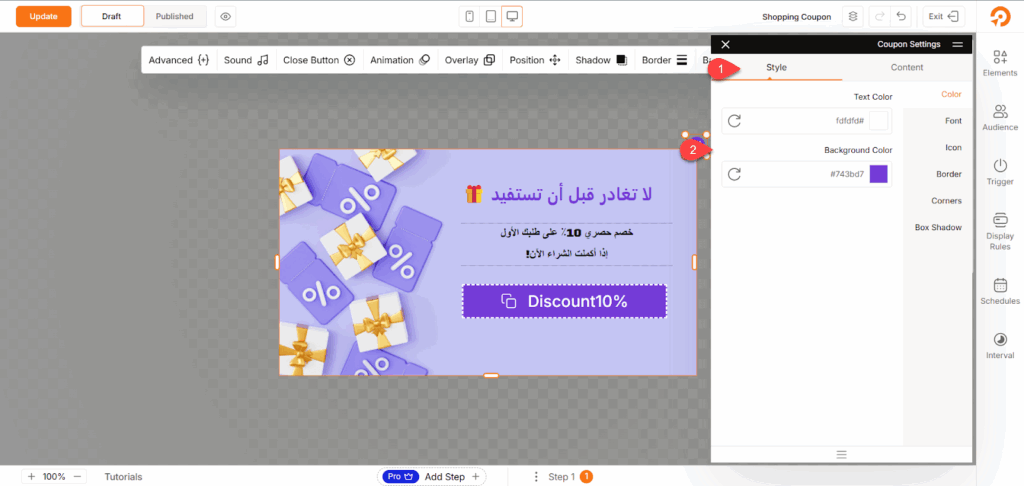 ثم انتقل إلى تبويب Style لتخصيص مظهر الكوبون من حيث ألوان الخط، الخلفية، الإطار، وما إلى ذلك.