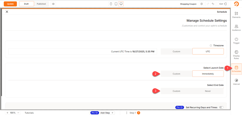 جدولة موعد ظهور حملة نافذة الخروج المنبثقة على المتجر.