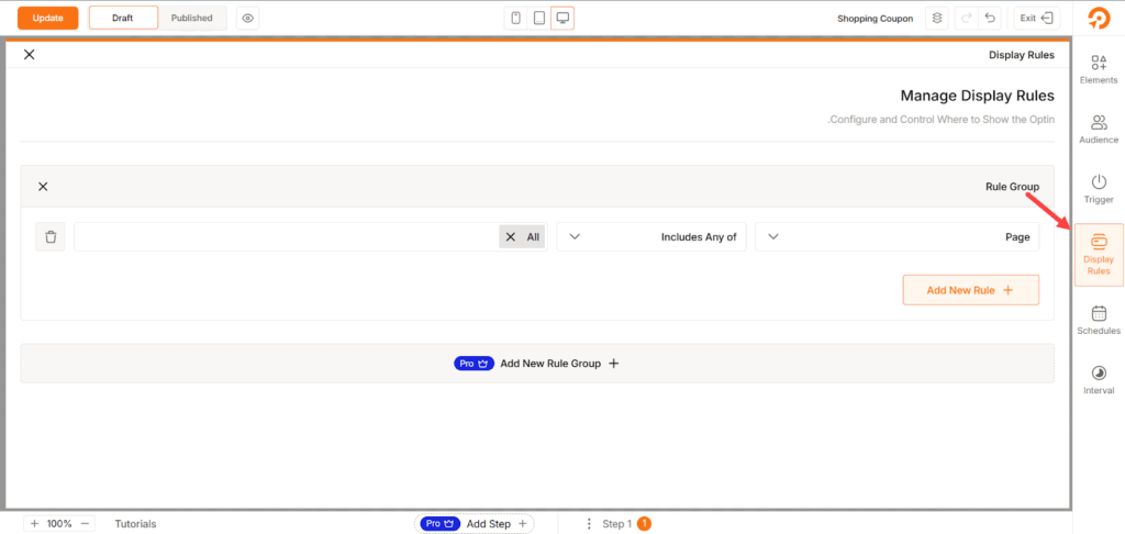 تحديد قواعد ظهور إعلان نافذة الخروج المنبثقة على المتجر.