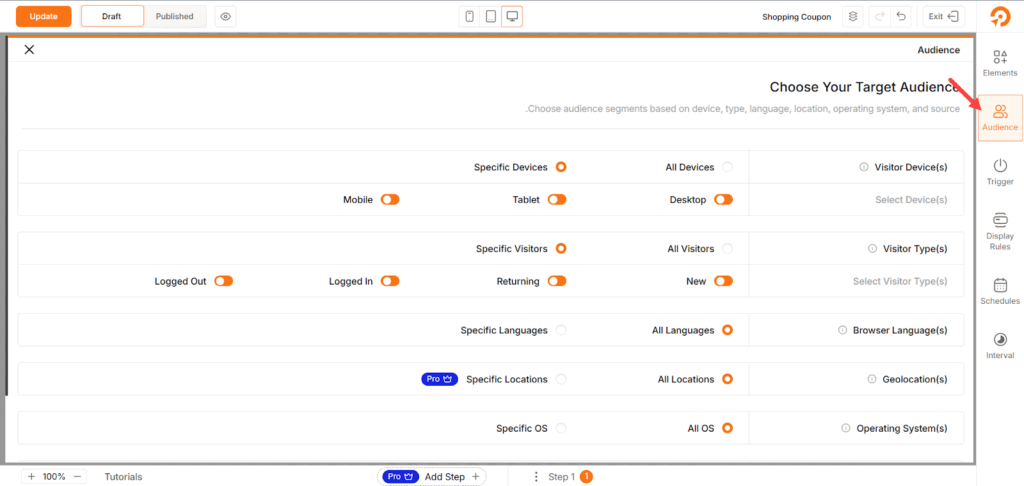 لذلك، بدأت بالتوجه إلى تبويب Audience من القائمة الجانبية، ثم بدأت بتحديد الأجهزة التي سيظهر الإعلان عليها، ونوع الزوار المستهدفين، مع إمكانية تعيين اشتراطات دقيقة مثل نظام تشغيل الهاتف، أو لغة المتصفح، أو الموقع الجغرافي، وغيرها من الخيارات التي تساعد على ضبط استهداف الإعلان بدقة عالية.