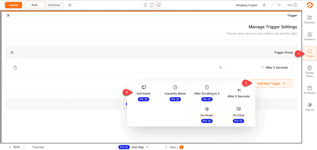 بعد ذلك، انتقلت إلى تبويب Trigger من القائمة الجانبية لتحديد نوع الإعلان. وفي حالتنا، نحتاج إلى إعداد إعلان يظهر عند محاولة الزائر مغادرة الموقع، لذا نضغط على Add New Trigger ثم نختار نوع الإعلان Exit Intent، وبذلك تظهر النوافذ المنبثقة بشكل ذكي عند محاولة الزائر مغادرة الموقع، اعتمادًا على تتبع حركة الماوس وسرعته.