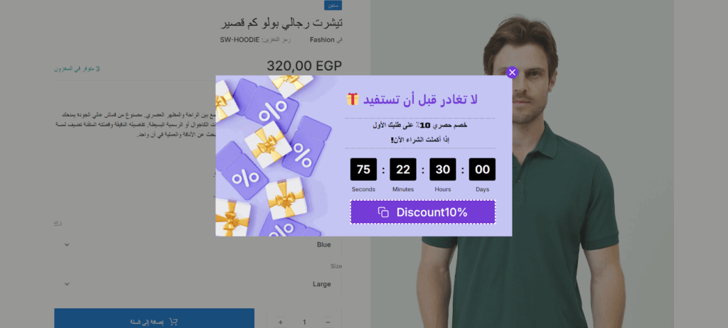 الآن انتقلت إلى المتجر لاختبار ظهور الإعلان. بدأت بتصفح المنتجات، ثم تحركت نحو إغلاق صفحة المتجر سريعًا، فظهر أمامي إعلان الخروج المنبثق مباشرة يتضمن كوبون الخصم، كما هو موضح في الصورة التالية: