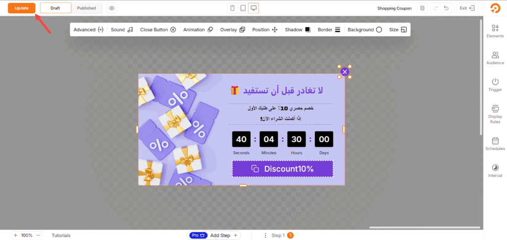 بنفس الطريقة، يمكنك تخصيص الإعلان بالكامل بما يتناسب مع استراتيجية التسويق وهوية المتجر. وبعد الانتهاء من جميع التعديلات، اضغط على زر Update لحفظ التغييرات والانتقال إلى الخطوة التالية.