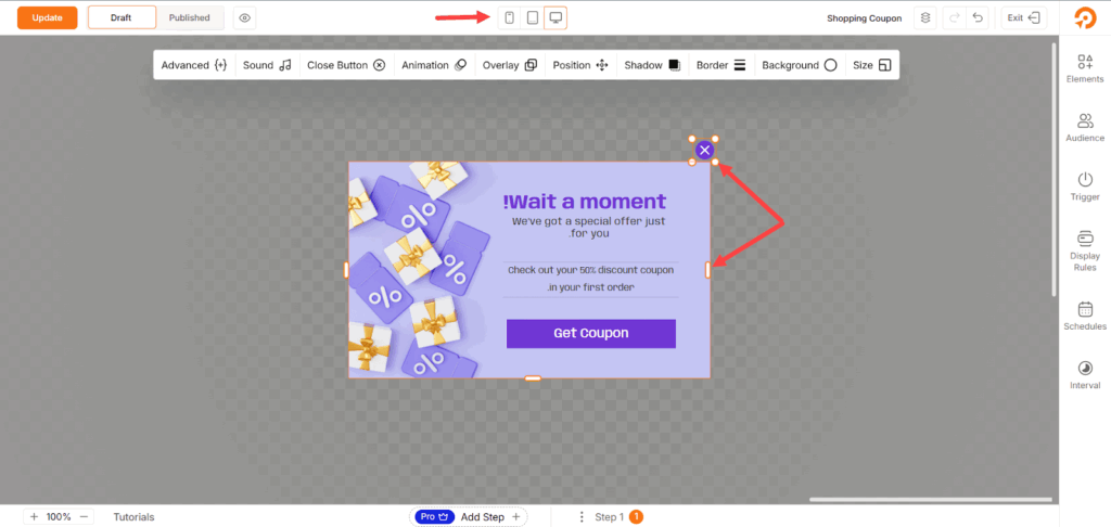 إضافة كوبون الخصم إلى إعلان نافذة الخروج المنبثقة.