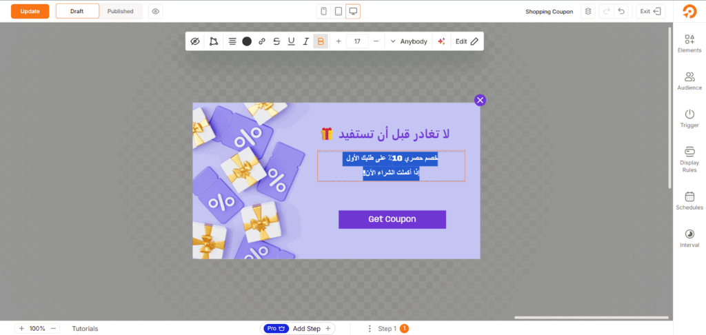 بعد استيراد نموذج الإعلان المناسب، تحتاج في هذه الخطوة أن تبدأ في تخصيص محتوى ومظهر الإعلان عبر إضافة نص جذاب، كوبون خصم، عروض خاصة، رسالة تذكير، أو غير ذلك.