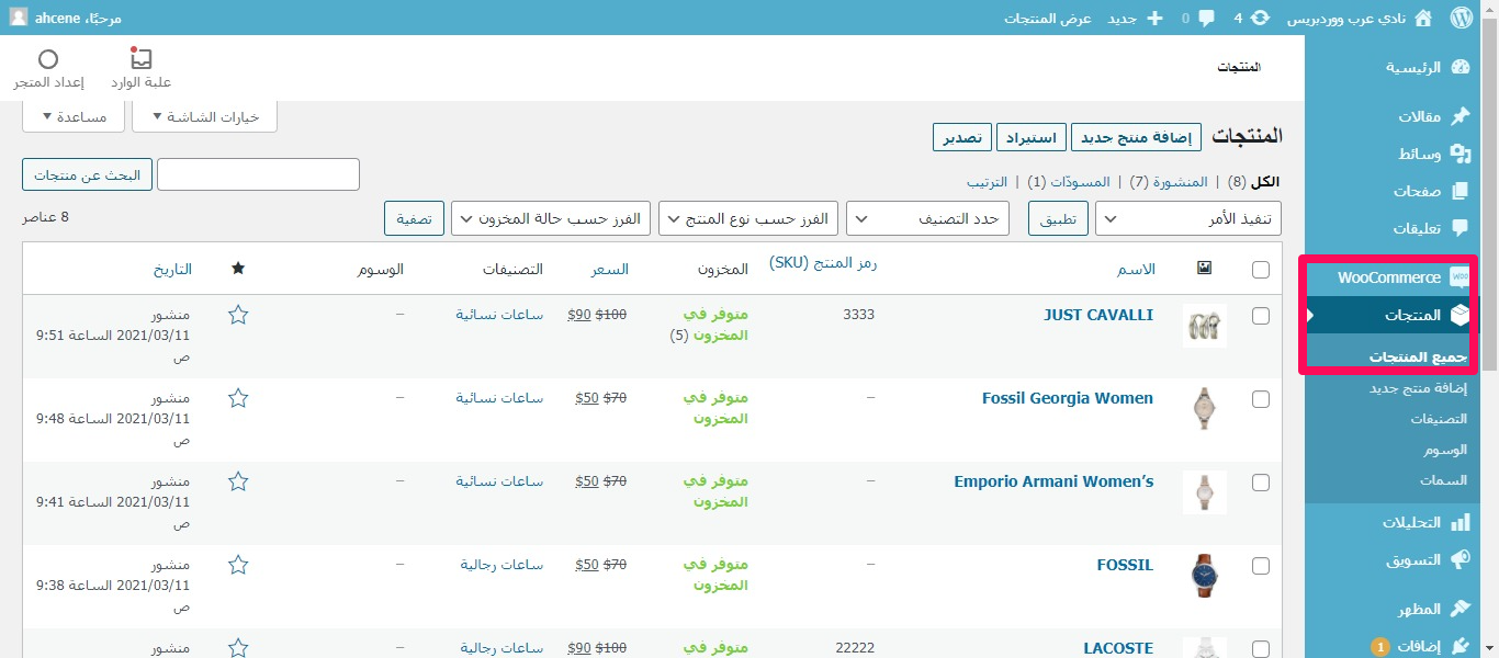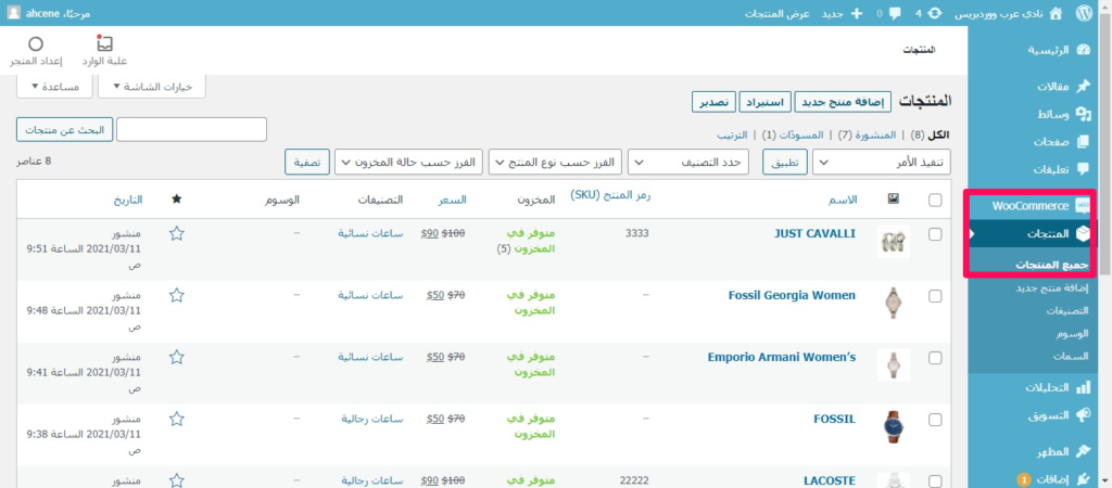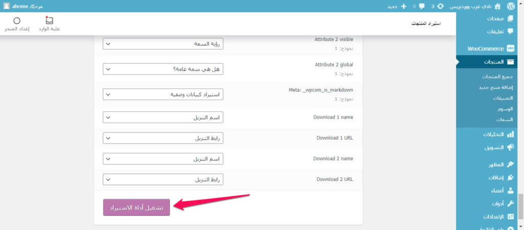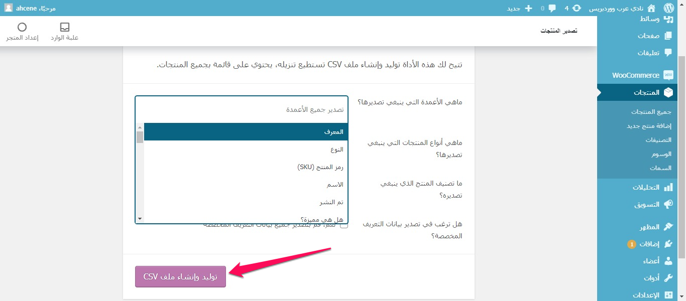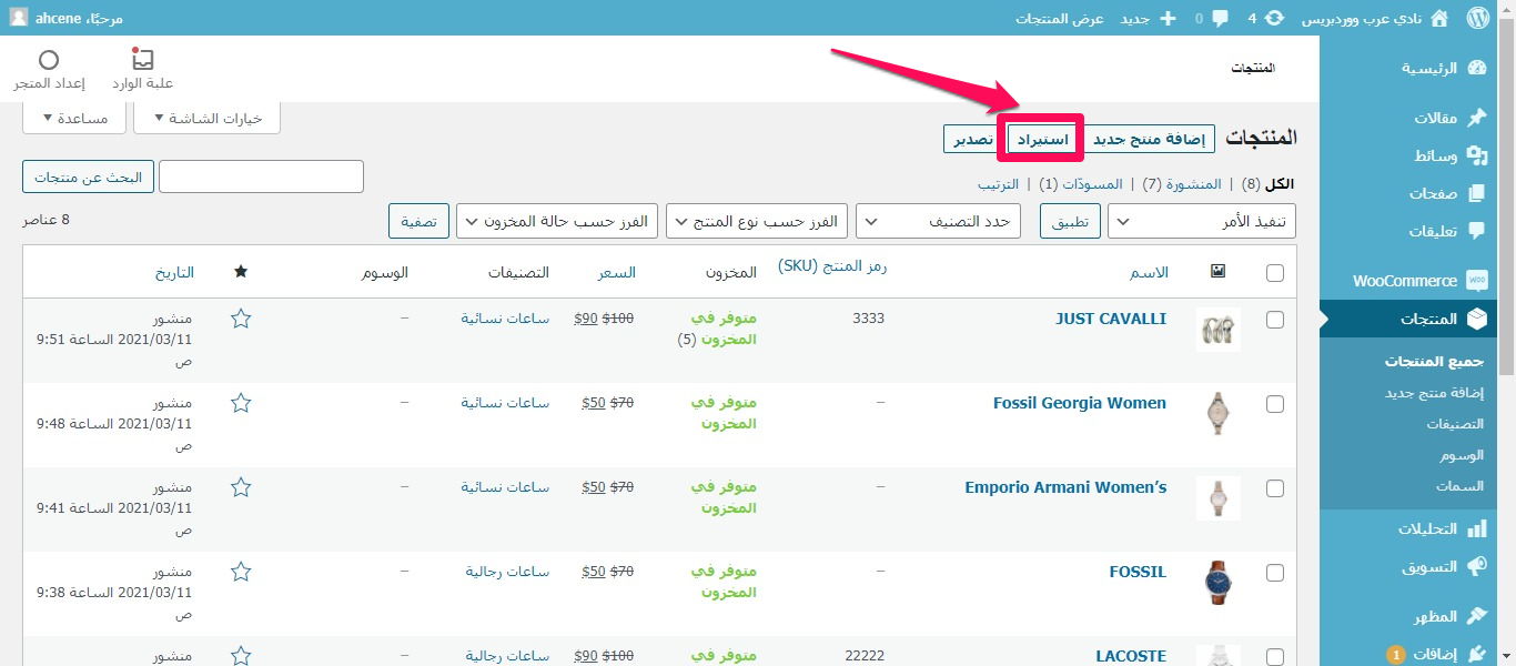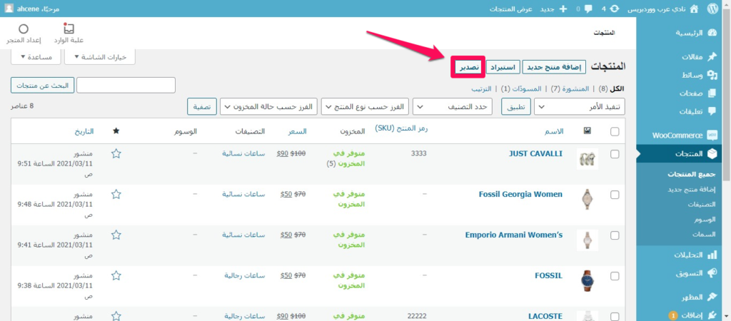 الدخول على لوحة التحكم في جميع منتجات ووكومرس والضغط على استيراد Export لتحميل ملف منتجاتنا.