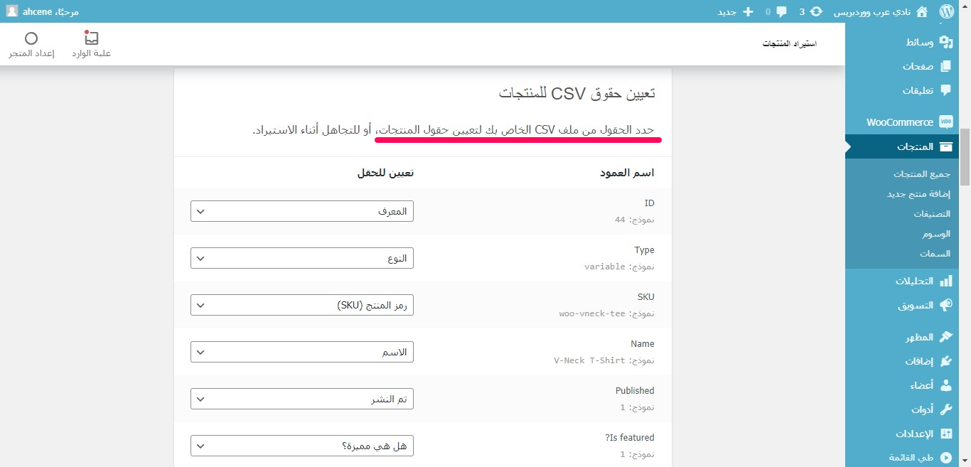 • تُحاول ووكومرس مطابقة اسم العمود من الملف CSV مع ما يناسبه في المنصة، وإن لم ترغب في تحميل عمود معين، اختر عدم الاستيراد من القائمة المُقابلة له.