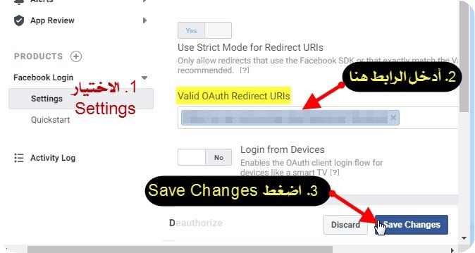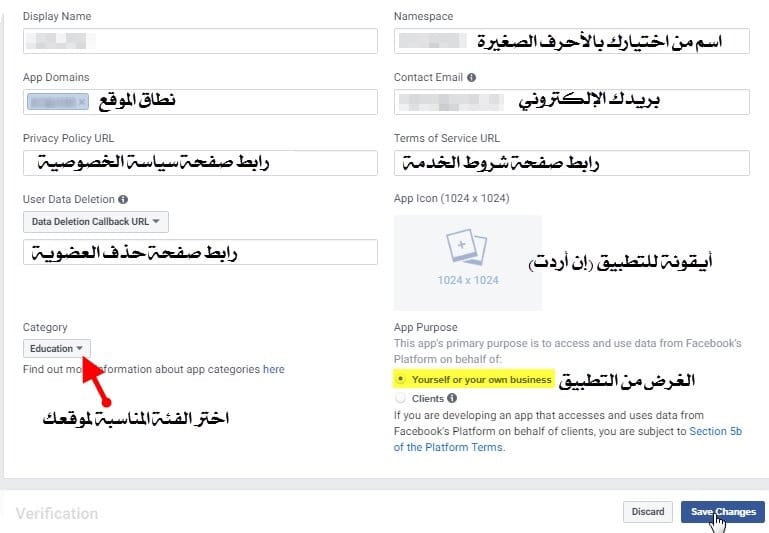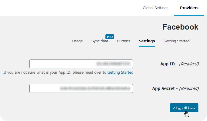 ستحتاج الآن إلى كلّ من الـ App ID وApp Secret اللّذين أنشأناهما سابقا مع تطبيق فيسبوك. املأ كلّ قيمة في مكانها المناسبة، واضغط (حفظ التّغييرات)