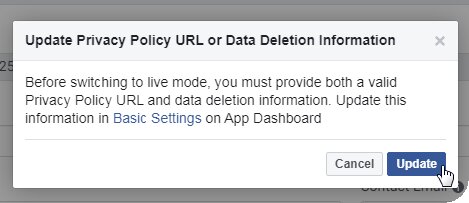 - قد تواجه الخطأ التّالي، وهو ناجم عن ترك إحدى خانتي سياسة الخصوصية، وحذف العضوية فارغة، أو كليهما. اضغط عندها Update، وتأكّد من ملئهما بالرّابطين المناسبين.