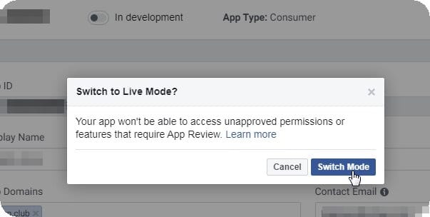 - بعد ضغطك In development، تظهر نافذة التّأكيد التّالية، فاضغط فيها Switch Mode لنقل التّطبيق إلى وضع التّشغيل.