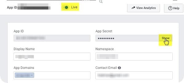- اضغط كلمة Show الموضّحة في الصّورة السّابقة. ثمّ احفظ في مكان آمن كلّا من:App ID و App Secret، واحتفظ بهما، إذ سنحتاجهما لاحقا.