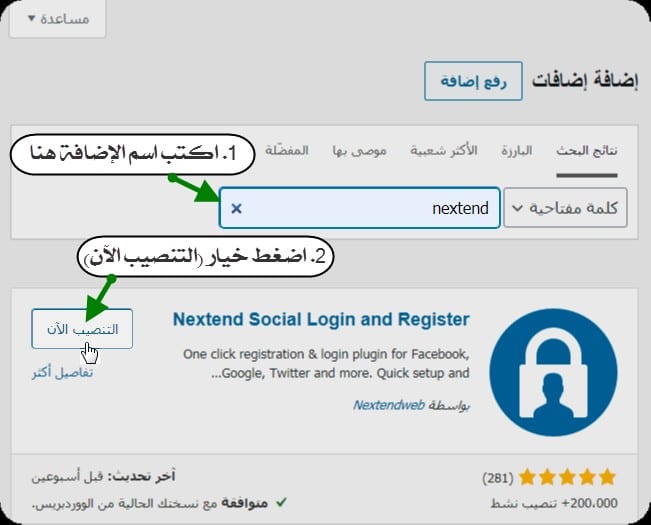 - اضغط على خيار "التّنصيب الآن" المحاذي للإضافة "Nextend Social Login and Register" كما تظهر الصّورة: