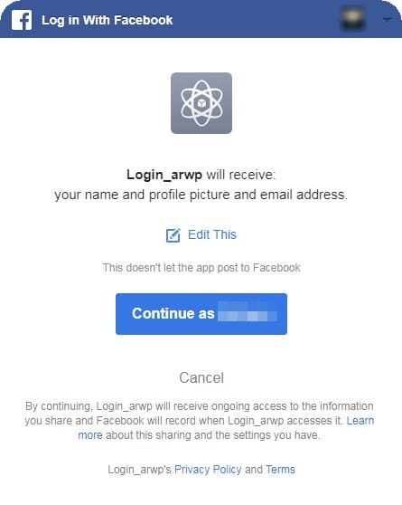 - ستظهر عندها نافذة تسجيل الدّخول عبر فيسبوك. اختر متابعة الدّخول (... Continue as).